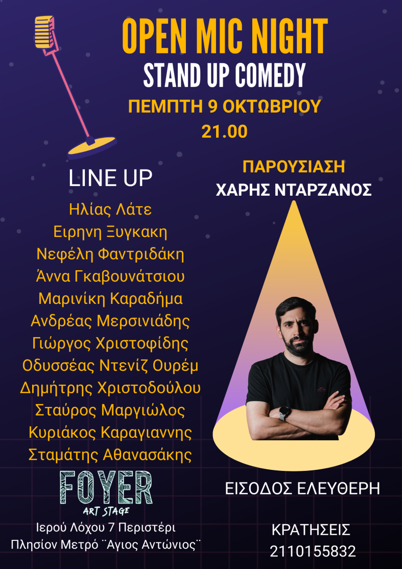 Το Foyer Art Stage φέρνει το Stand Up στα δυτικά με δυο παραστάσεις κάθε μήνα κάνοντας τις Πέμπτες μας, την διέξοδο με γέλιο από την καθημερινότητα μας!